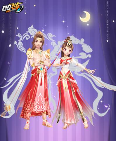 与天外飞仙套装一样极具异域风格,飞舞的彩带迎风舒卷,流云飘飞于人物四周,仙气十足。华丽的精致配饰凸显男生的清秀眉目,女生衣裙轻软巾带宽长,舒展身姿翩翩起舞。