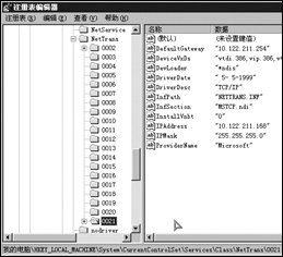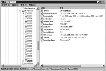 网络协议的安装状况的。依次点击各个子项,可以找到其中一个在右侧窗口中的名称列表中包含有DriverDesc、DefaultGateway、IPAddress和IPMask项,且对应的值与当前的