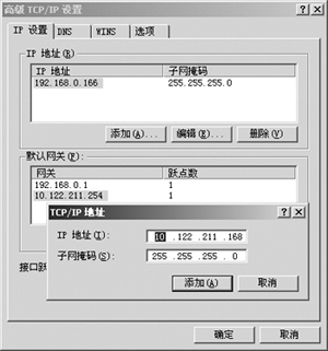 Windows 2000下实施多IP绑定的方法比较简单:在“Internet协议(TCP/IP)属性”窗口中单击[高级]按钮,打开“高级TCP/IP设置”窗口,单击“IP设置”选项卡“IP地址”栏中的[添加]按钮,在弹出的“TCP/IP地址”对话框中输入新的IP地址与子网掩码(如图2所示),再依次点击[添加]与主窗口中的[确定]按钮返回系统即可。