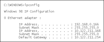 Windows 98没有直接进行多IP绑定的方法,但通过修改注册表同样可以达到目的。步骤如下:按“方法一”所述步骤在注册表中找到图1所示的位置,双击右侧窗口中的IPAddress选项,弹出如图3(请见B5版)所示的“编辑字符串”对话框,在“键值”栏里添加新的IP地址,注意新增的IP地址与原IP地址间要用逗号隔开。同样的方法在IPMask、DefaultGateway中添加对应的子网掩码、默认网关。全部添加完毕后得到图4所示结果,然后重新启动计算机,在系统提示符状态下运行ipconfig命令,是不是看到了图5所示的内容?这表明计算机的一块网卡上已经绑定了10.122.211.168和192.168.0.166两个IP地址。