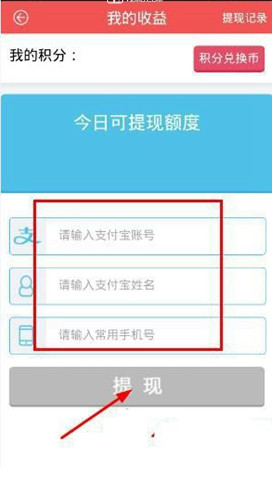2、在我的收益界面,可以查看你的可提现额度,输入支付宝账号,支付宝姓名,手机号,点击提现按钮,就可以提现的