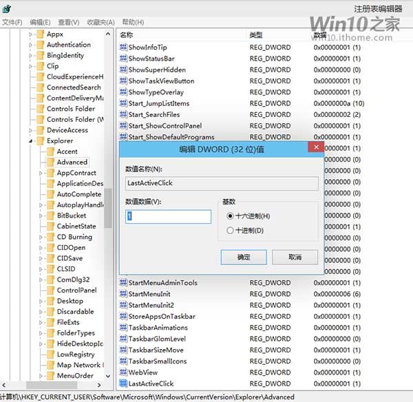 3、在右边窗口新建DWORD(32位)值,命名为LastActiveClick,双击打开后,将数值数据改为“1”并确定