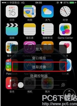 6、点【选取滤镜】,选择【弱光】,把最下面的光标移动到最左边(即表示不放大屏幕),最后点击屏幕空白处就完成。