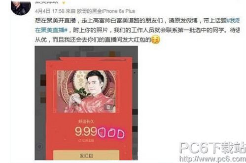 1、想要在聚美上直播,需要通过申请才可以直播的,聚美ceo陈欧的微博上发的微博:在我想在聚美上直播微博界面,附上你的照片,工作人员将会联系第一批选中的同学,待遇从优,而且我还会去你们的直播间发红包的哟。
