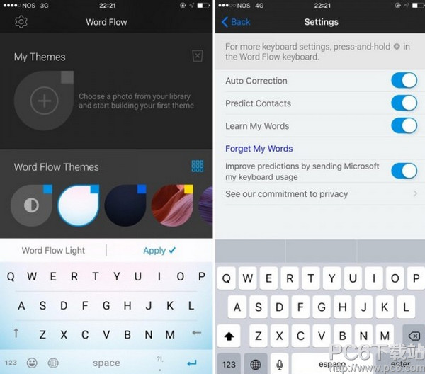 一些个性化选项,比如自定义背景,既可以选择应用中预设的背景,也可以选择你自己喜欢的图片作为背景。Word Flow要求的最低系统版本为iOS 9,应用内置了8套不同的主题。大家可以先看下视频,了解到该如何设置颜色: