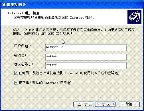 7、在下图的界面中各框里相应的输入运营商提供给你的帐号、密码,底下几个(两个或三个)可选项默认是选中,可根据需要选择,然后再点“下一步”。